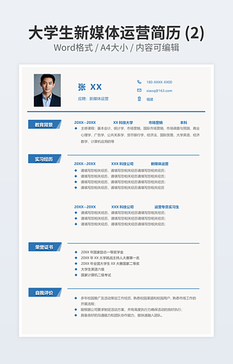 本作品内容为视频剪辑实习生简历下载,大小为186.33KB,作品为高清大图模板,格式为docx, 属于产品运营模板,作品模板源文件下载后可用编辑替换,模板中如有人物画像仅供参考禁止商用。小Q办公网-提供简历,PPT,Word,Excel优质模板素材下载模版平台,拥有海量的工作总结、竞聘求职、年终颁奖、计划书等。 通过小Q办公网下载产品运营模板源文件编辑修改源文件文字和图片即可使用。