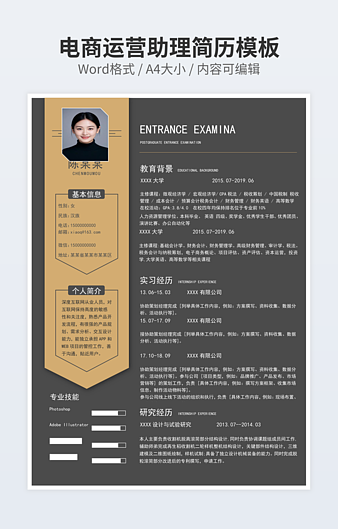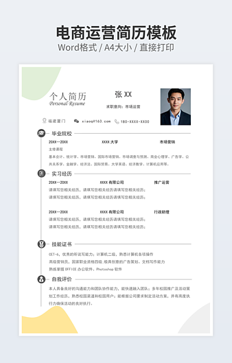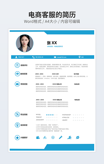 本作品内容为跨境电商个人简历信息下载,大小为431.31KB,作品为高清大图模板,格式为docx, 属于产品运营模板,作品模板源文件下载后可用编辑替换,模板中如有人物画像仅供参考禁止商用。小Q办公网-提供简历,PPT,Word,Excel优质模板素材下载模版平台,拥有海量的工作总结、竞聘求职、年终颁奖、计划书等。 通过小Q办公网下载产品运营模板源文件编辑修改源文件文字和图片即可使用。