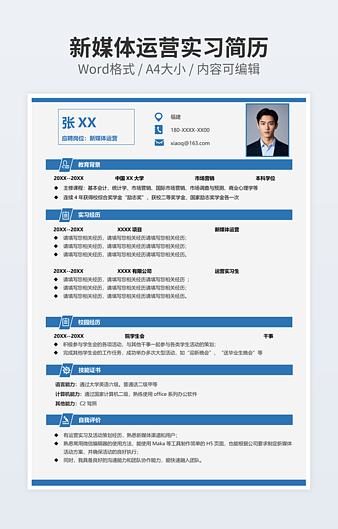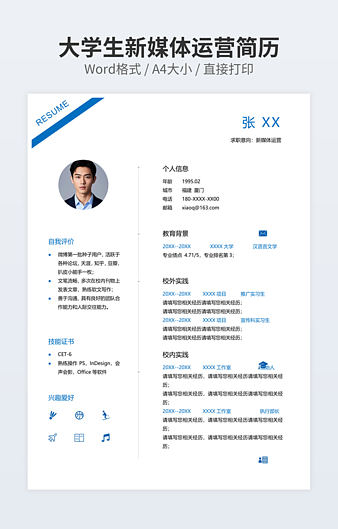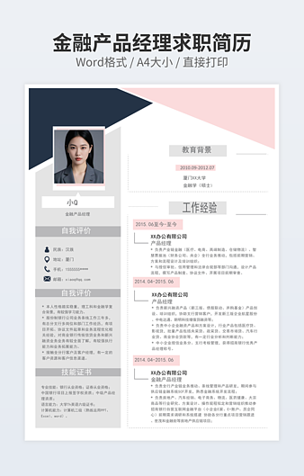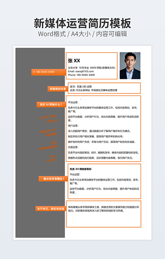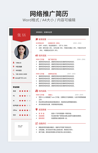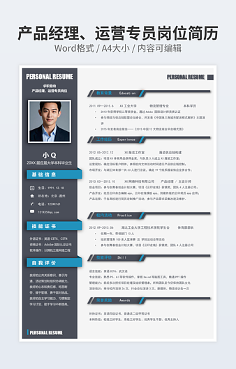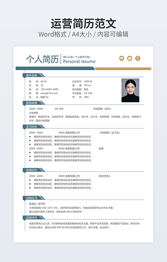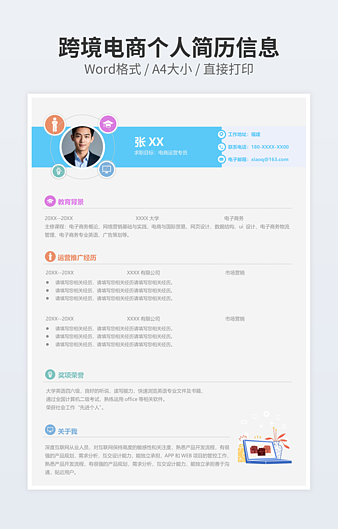 本作品内容为跨境电商面试简历下载,大小为230.4KB,作品为高清大图模板,格式为docx, 属于产品运营模板,作品模板源文件下载后可用编辑替换,模板中如有人物画像仅供参考禁止商用。小Q办公网-提供简历,PPT,Word,Excel优质模板素材下载模版平台,拥有海量的工作总结、竞聘求职、年终颁奖、计划书等。 通过小Q办公网下载产品运营模板源文件编辑修改源文件文字和图片即可使用。