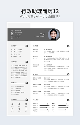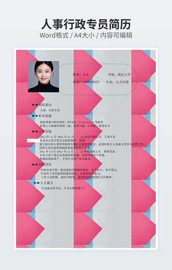本作品内容为淘宝客服个人简历模板下载,大小为54.82KB,作品为高清大图模板,格式为docx, 属于文职类模板,作品模板源文件下载后可用编辑替换,模板中如有人物画像仅供参考禁止商用。小Q办公网-提供简历,PPT,Word,Excel优质模板素材下载模版平台,拥有海量的工作总结、竞聘求职、年终颁奖、计划书等。 通过小Q办公网下载文职类模板源文件编辑修改源文件文字和图片即可使用。