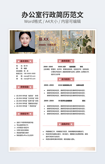 本作品内容为行政主管求职简历下载,大小为875.36KB,作品为高清大图模板,格式为docx, 属于文职类模板,作品模板源文件下载后可用编辑替换,模板中如有人物画像仅供参考禁止商用。小Q办公网-提供简历,PPT,Word,Excel优质模板素材下载模版平台,拥有海量的工作总结、竞聘求职、年终颁奖、计划书等。 通过小Q办公网下载文职类模板源文件编辑修改源文件文字和图片即可使用。