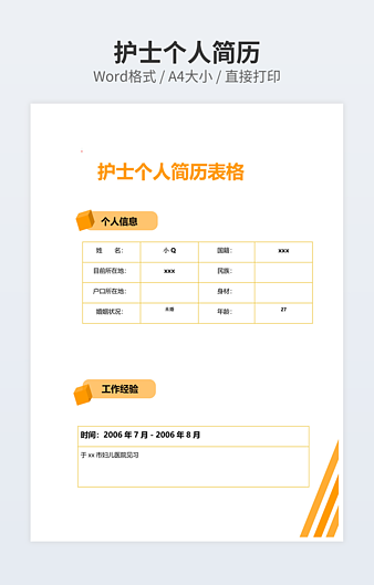 【特殊限制】设计师仅对作品中独创性部分享有著作权,对作品中含有的国旗、国徽等政治图案不享有权利,仅作为作品整体效果的示例展示,禁止商用。 相关关键词: 护理 专业 实习 简历 模板