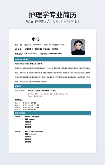 本作品内容为护理专业实习简历模板下载,大小为112.85KB,作品为高清大图模板,格式为docx, 属于医护专业模板,作品模板源文件下载后可用编辑替换,模板中如有人物画像仅供参考禁止商用。小Q办公网-提供简历,PPT,Word,Excel优质模板素材下载模版平台,拥有海量的工作总结、竞聘求职、年终颁奖、计划书等。 通过小Q办公网下载医护专业模板源文件编辑修改源文件文字和图片即可使用。