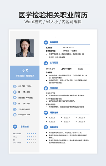 本作品内容为简历医生模板下载,大小为38.75KB,作品为高清大图模板,格式为docx, 属于医护专业模板,作品模板源文件下载后可用编辑替换,模板中如有人物画像仅供参考禁止商用。小Q办公网-提供简历,PPT,Word,Excel优质模板素材下载模版平台,拥有海量的工作总结、竞聘求职、年终颁奖、计划书等。 通过小Q办公网下载医护专业模板源文件编辑修改源文件文字和图片即可使用。