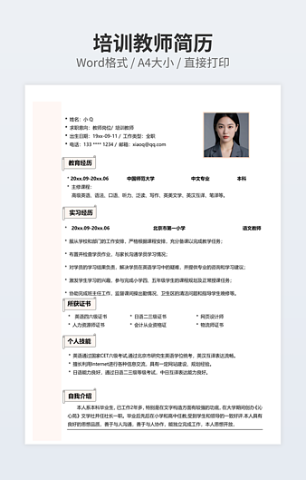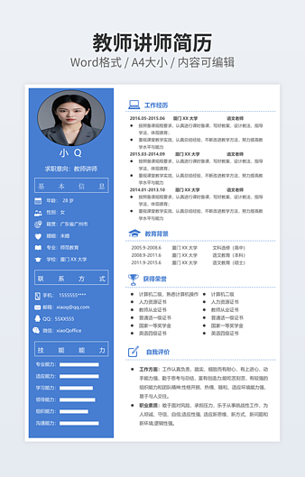 本作品内容为培训讲师个人简历ppt下载,大小为209.98KB,作品为高清大图模板,格式为docx, 属于教师模板,作品模板源文件下载后可用编辑替换,模板中如有人物画像仅供参考禁止商用。小Q办公网-提供简历,PPT,Word,Excel优质模板素材下载模版平台,拥有海量的工作总结、竞聘求职、年终颁奖、计划书等。 通过小Q办公网下载教师模板源文件编辑修改源文件文字和图片即可使用。