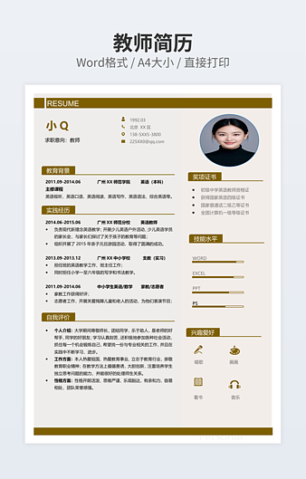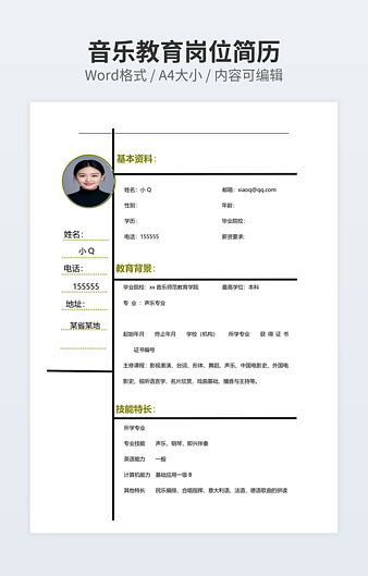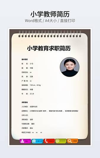 本作品内容为幼师专业个人简历下载,大小为136.29KB,作品为高清大图模板,格式为docx, 属于教师模板,作品模板源文件下载后可用编辑替换,模板中如有人物画像仅供参考禁止商用。小Q办公网-提供简历,PPT,Word,Excel优质模板素材下载模版平台,拥有海量的工作总结、竞聘求职、年终颁奖、计划书等。 通过小Q办公网下载教师模板源文件编辑修改源文件文字和图片即可使用。