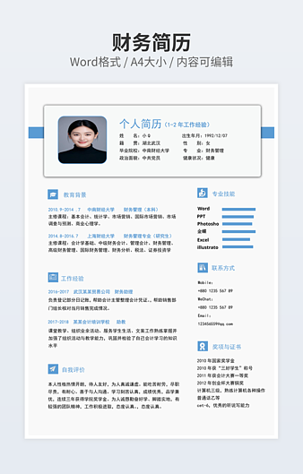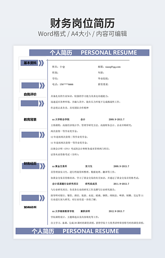 【特殊限制】设计师仅对作品中独创性部分享有著作权,对作品中含有的国旗、国徽等政治图案不享有权利,仅作为作品整体效果的示例展示,禁止商用。 相关关键词: 财务 人员 个人简历 范文