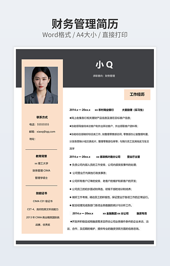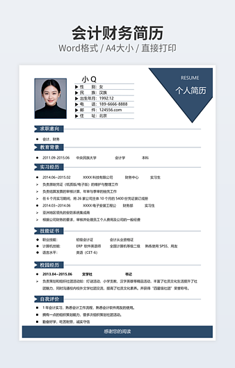 本作品内容为财务人员个人简历范文下载,大小为167.13KB,作品为高清大图模板,格式为docx, 属于会计出纳模板,作品模板源文件下载后可用编辑替换,模板中如有人物画像仅供参考禁止商用。小Q办公网-提供简历,PPT,Word,Excel优质模板素材下载模版平台,拥有海量的工作总结、竞聘求职、年终颁奖、计划书等。 通过小Q办公网下载会计出纳模板源文件编辑修改源文件文字和图片即可使用。