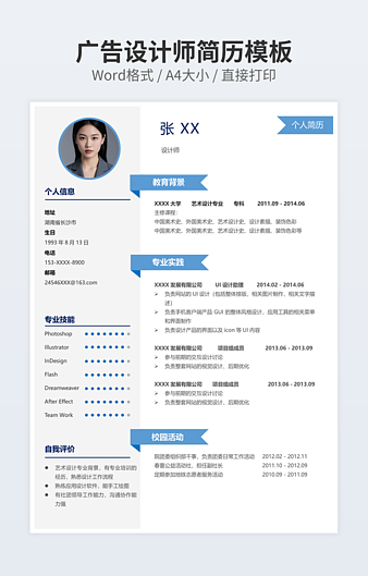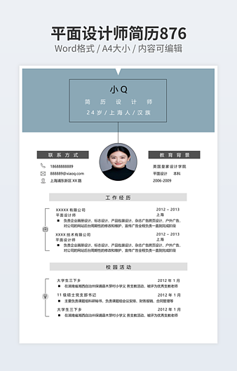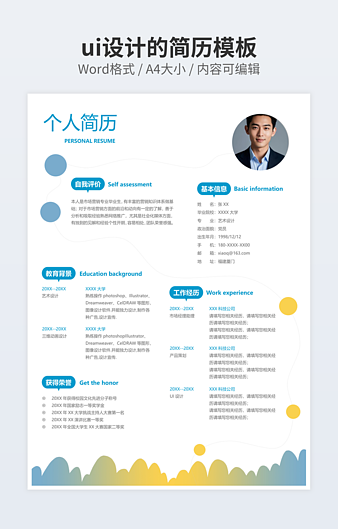 本作品内容为ui设计师的简历下载,大小为74.13KB,作品为高清大图模板,格式为docx, 属于设计相关模板,作品模板源文件下载后可用编辑替换,模板中如有人物画像仅供参考禁止商用。小Q办公网-提供简历,PPT,Word,Excel优质模板素材下载模版平台,拥有海量的工作总结、竞聘求职、年终颁奖、计划书等。 通过小Q办公网下载设计相关模板源文件编辑修改源文件文字和图片即可使用。