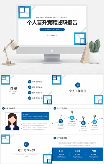 本作品内容为蓝色简约风竞聘晋升述职报告PPT模板下载,大小为39.3MB,作品为高清大图模板,格式为pptx, 属于转正述职模板,作品模板源文件下载后可用编辑替换,模板中如有人物画像仅供参考禁止商用。小Q办公网-提供简历,PPT,Word,Excel优质模板素材下载模版平台,拥有海量的工作总结、竞聘求职、年终颁奖、计划书等。 通过小Q办公网下载转正述职模板源文件编辑修改源文件文字和图片即可使用。