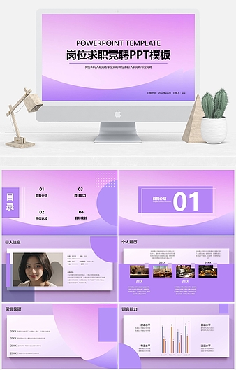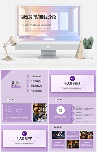 本作品内容为紫色简约风自我介绍简历PPT模板下载,大小为37.98MB,作品为高清大图模板,格式为pptx, 属于竞聘简历模板,作品模板源文件下载后可用编辑替换,模板中如有人物画像仅供参考禁止商用。小Q办公网-提供简历,PPT,Word,Excel优质模板素材下载模版平台,拥有海量的工作总结、竞聘求职、年终颁奖、计划书等。 通过小Q办公网下载竞聘简历模板源文件编辑修改源文件文字和图片即可使用。
