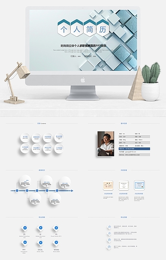 【特殊限制】设计师仅对作品中独创性部分享有著作权,对作品中含有的国旗、国徽等政治图案不享有权利,仅作为作品整体效果的示例展示,禁止商用。 相关关键词: 蓝色 个性 简历 PPT 模板