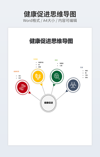 本作品内容为健康思维导图示例下载,大小为33.28KB,作品为高清大图模板,格式为docx, 属于思维导图模板,作品模板源文件下载后可用编辑替换,模板中如有人物画像仅供参考禁止商用。小Q办公网-提供简历,PPT,Word,Excel优质模板素材下载模版平台,拥有海量的工作总结、竞聘求职、年终颁奖、计划书等。 通过小Q办公网下载思维导图模板源文件编辑修改源文件文字和图片即可使用。