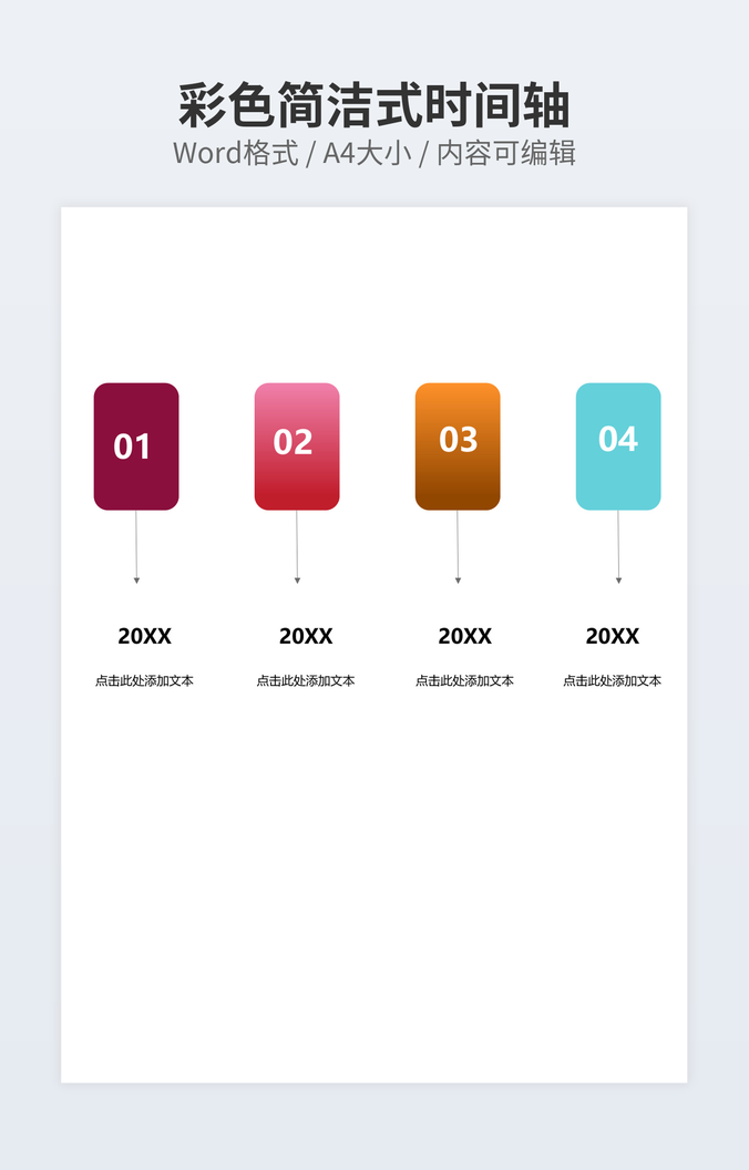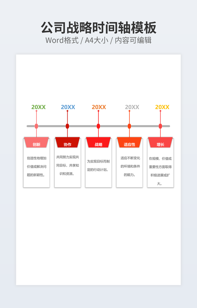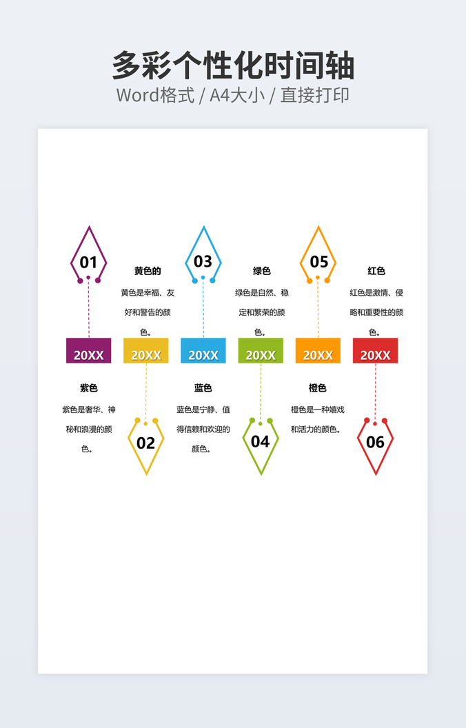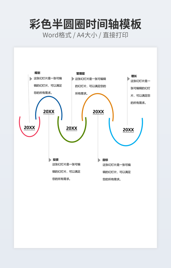 本作品内容为彩色时间轴商业计划下载,大小为49.96KB,作品为高清大图模板,格式为docx, 属于时间轴模板,作品模板源文件下载后可用编辑替换,模板中如有人物画像仅供参考禁止商用。小Q办公网-提供简历,PPT,Word,Excel优质模板素材下载模版平台,拥有海量的工作总结、竞聘求职、年终颁奖、计划书等。 通过小Q办公网下载时间轴模板源文件编辑修改源文件文字和图片即可使用。
