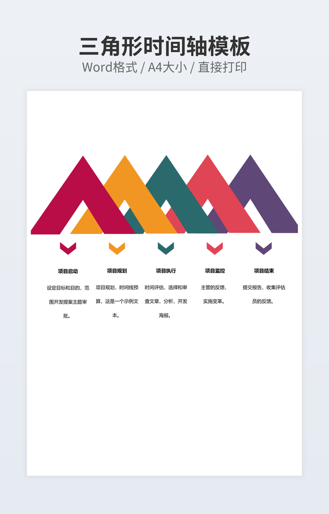 本作品内容为项目成立流程时间轴模板下载,大小为38.97KB,作品为高清大图模板,格式为docx, 属于时间轴模板,作品模板源文件下载后可用编辑替换,模板中如有人物画像仅供参考禁止商用。小Q办公网-提供简历,PPT,Word,Excel优质模板素材下载模版平台,拥有海量的工作总结、竞聘求职、年终颁奖、计划书等。 通过小Q办公网下载时间轴模板源文件编辑修改源文件文字和图片即可使用。